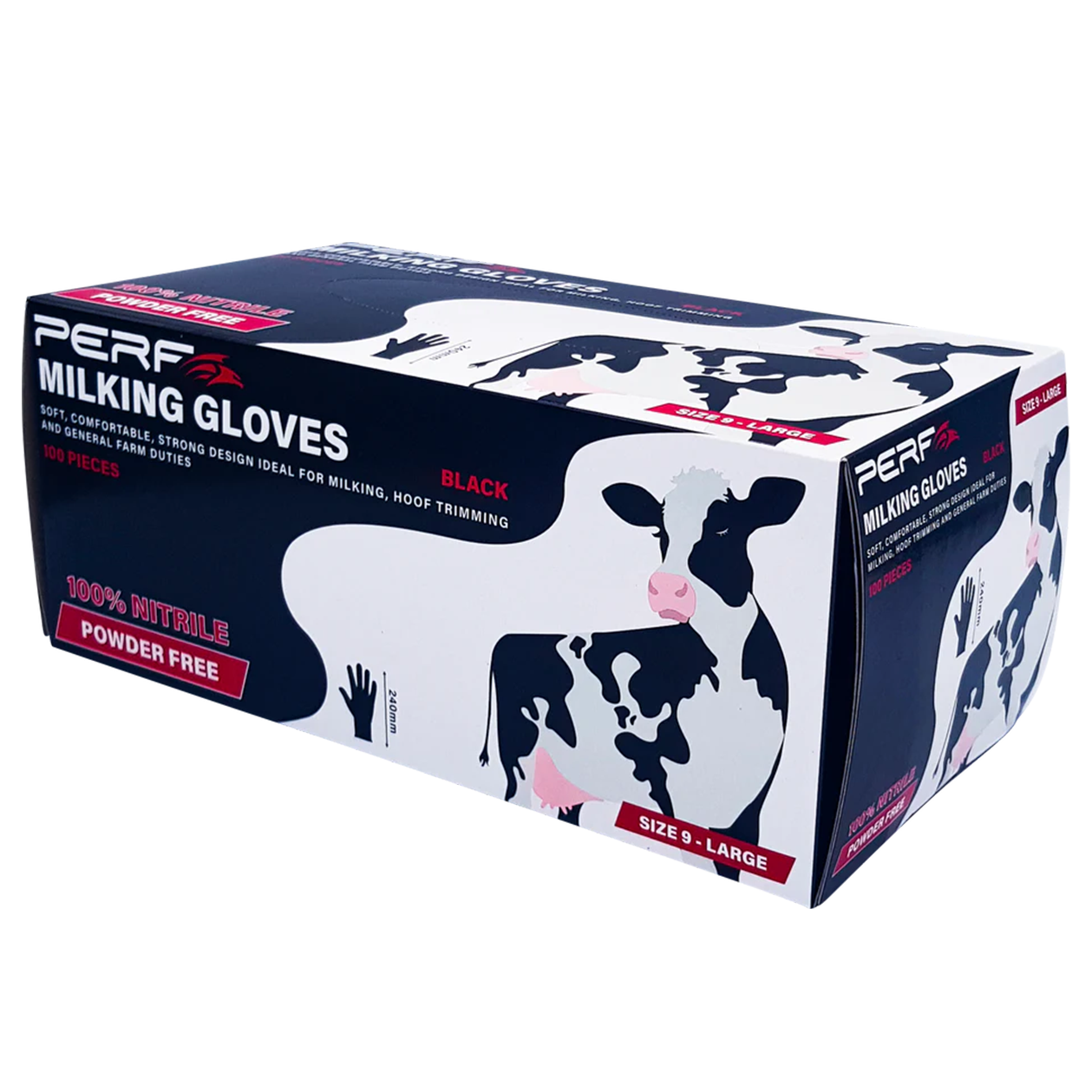 Perf - 240mm Milking Gloves - Powder Free Nitrile Gloves - Black - 100 Pack
